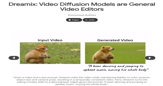 Dreamix 编辑视频,同时保持颜色、姿势、对象大小和相机姿势。